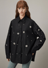 【DESIGN / STYLING】フロントから袖にかけて散りばめられたクリスタル調のフラワーモチーフが、シンプルなブラックシャツに華やかな輝きを添えるデザイン。きらめくビジューが立体感を生み出し、視線を引きつけるラグジュアリーな印象を演出します。オーバーサイズのシルエットは、リラックス感がありながらもモードな雰囲気を纏わせ、抜け感とトレンド感を同時に表現。ドロップショルダーと長めの丈感が絶妙なバランスをつくり、洗練されたシルエットを実現します。ハリのある素材を用いることで、ラフすぎず程よいきちんと感をキープ。デイリーからドレスアップまで幅広く活躍でき、ワードローブに一枚あるだけでコーディネートを格上げしてくれる頼れる存在です。