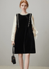 【DESIGN / STYLING】深みのあるブラックのベルベット調生地を使用し、シックで高級感あふれる雰囲気を纏うワンピース。ネックラインとフロントラインにはパールとフリルを組み合わせた装飾を施し、華やかでクラシカルな印象をプラスしています。袖には透け感のある素材にプリーツ加工を施したラッフルをドッキングし、軽やかさと立体感を加えたデザインに。全体は体のラインを拾わないストレートシルエットで、リラックス感と洗練された印象を両立。さらに背面には小さな涙開きを配し、着脱のしやすさとさりげない女性らしさを演出します。クラシックやモード、フレンチシックな要素を自然に融合させ、ドラマティックさとロマンティックさの両方を兼ね備えた、大人の女性にふさわしい一枚です。
