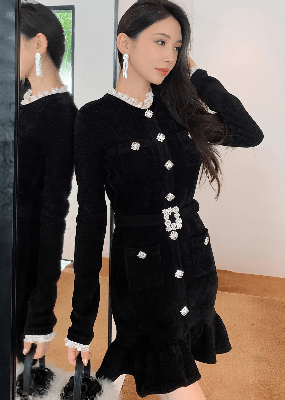 ビジューベルトフリルヘムラインドレス