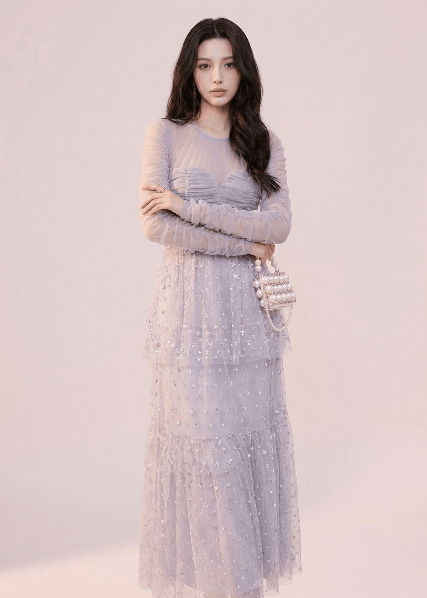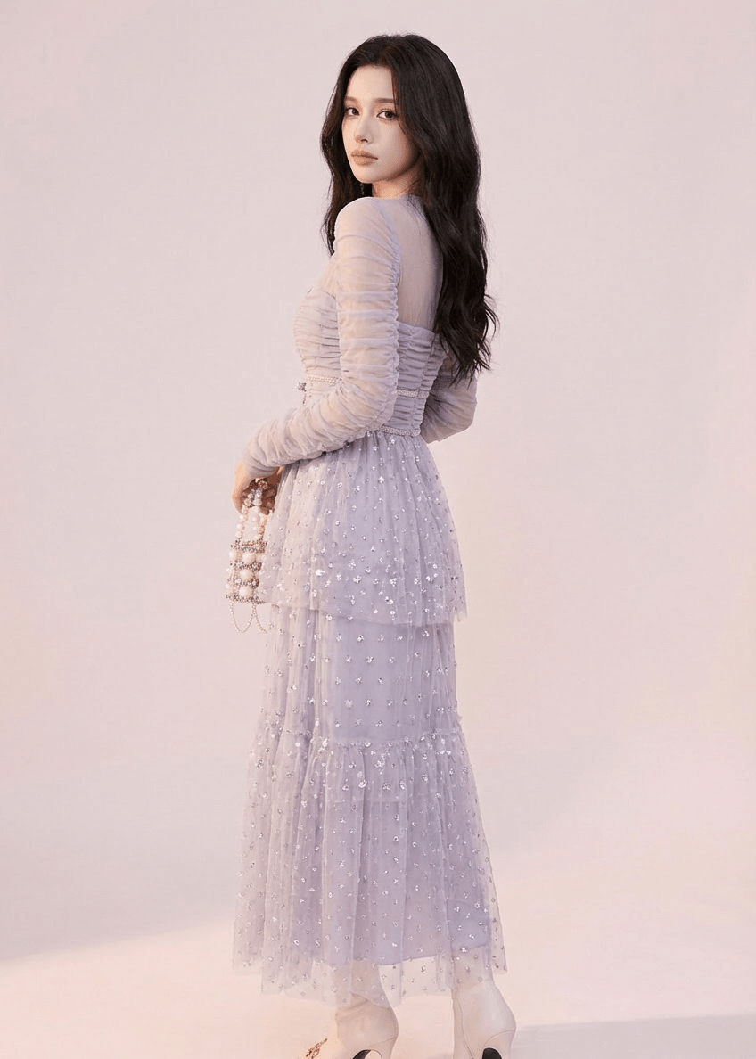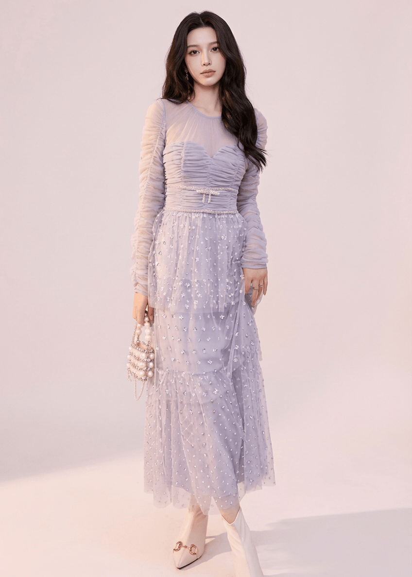 やわらかなシアー素材に施されたシャーリングデザインが、立体的な表情を生み出し、軽やかで奥行きのある美しさを演出します。ほんのりと光を受けてきらめく質感が、まるで星屑を纏ったかのような幻想的な印象を与え、視線を惹きつける一着です。