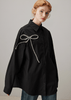 【DESIGN / STYLING】クラシックなレギュラーカラーをベースにしながら、肩にあしらわれたビジューボウが印象的な一枚。ラインストーンとビーズを組み合わせた立体的なリボンモチーフは、シンプルなブラックシャツにラグジュアリーな輝きを添え、モードな存在感を放ちます。全体はゆったりとしたオーバーサイズのボックスシルエットで仕立てられており、抜け感とリラックス感を兼ね備えながらも、洗練された雰囲気を演出。スカートやスラックスでドレッシーにまとめても映える、一枚でワードローブに加えたいマストハブアイテムです。