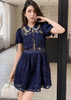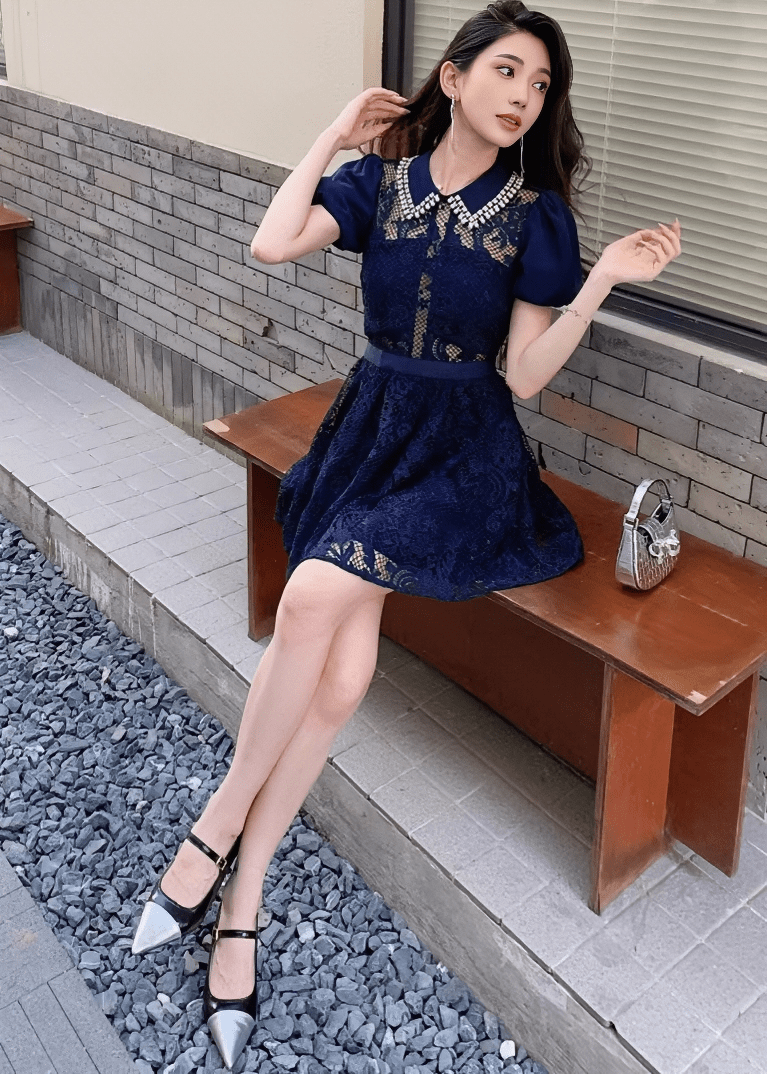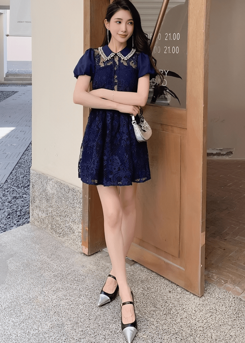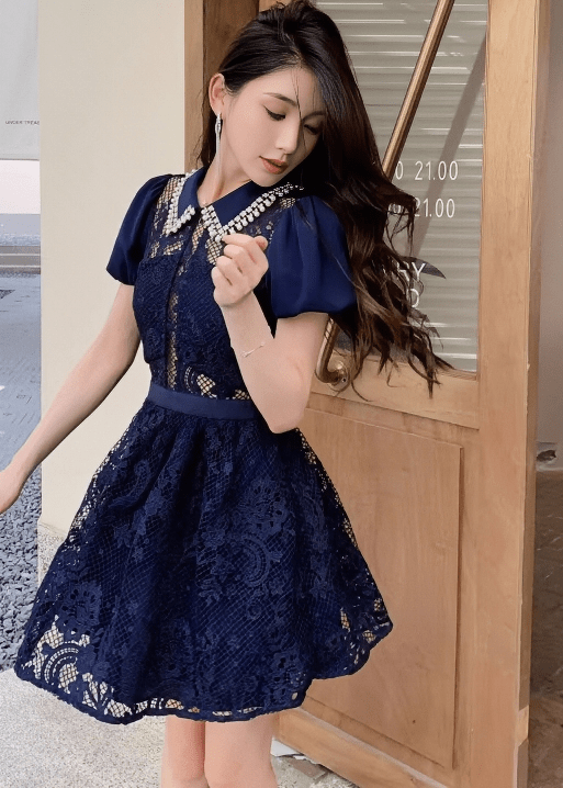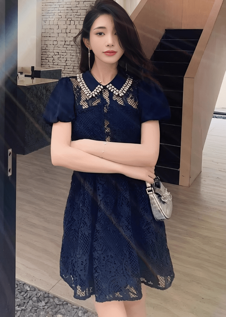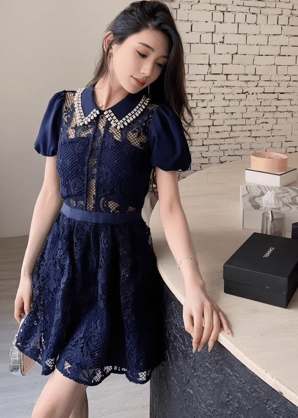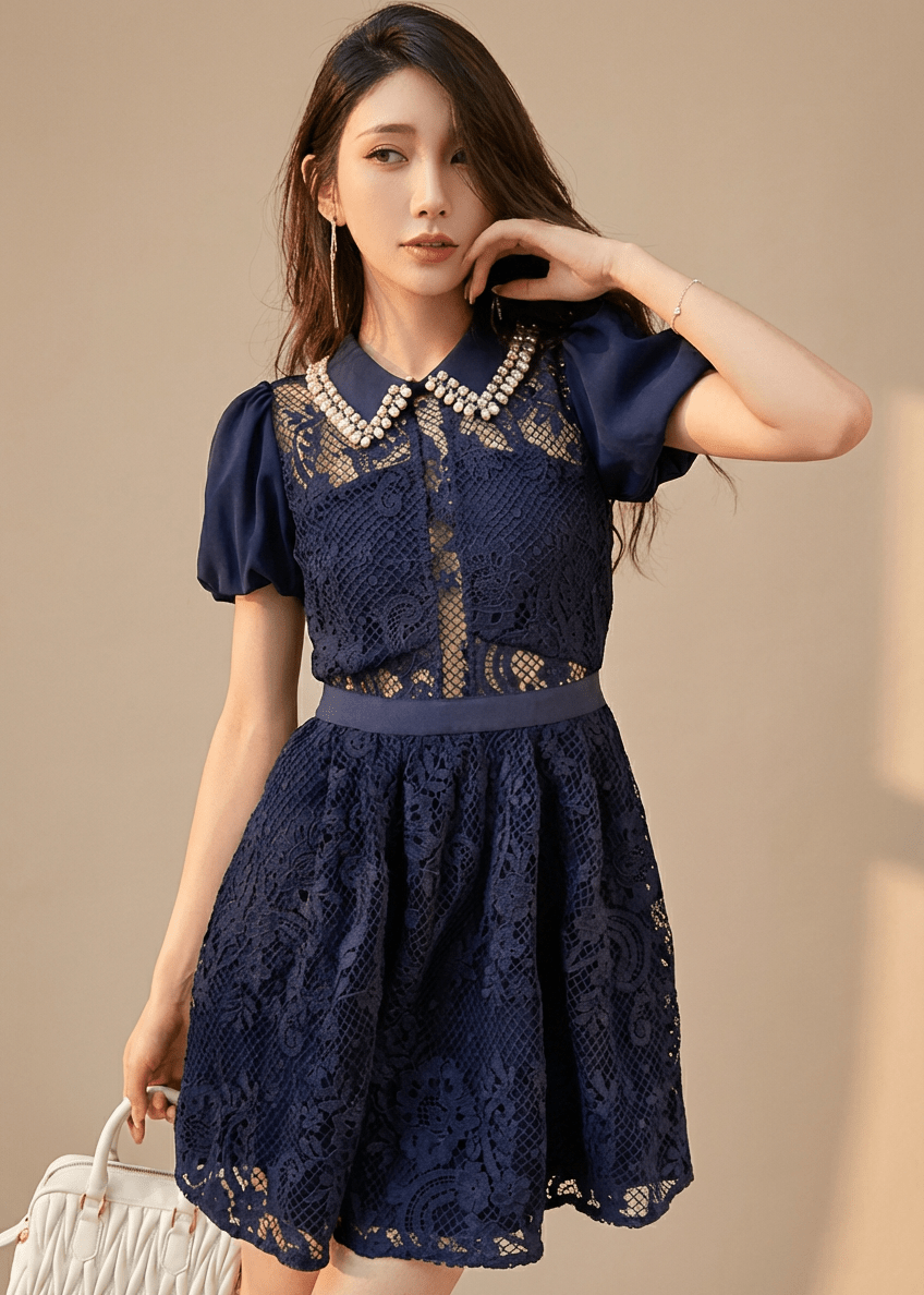 ビジューカラーシアーレースパフスリーブドレス - Vera Lumina