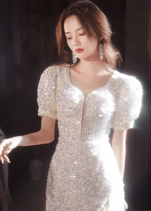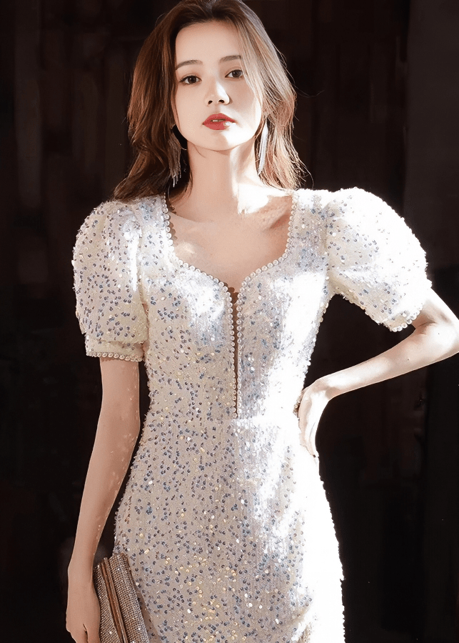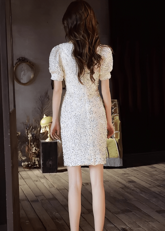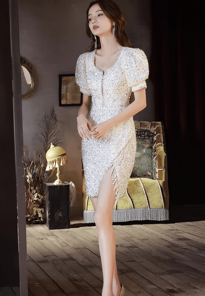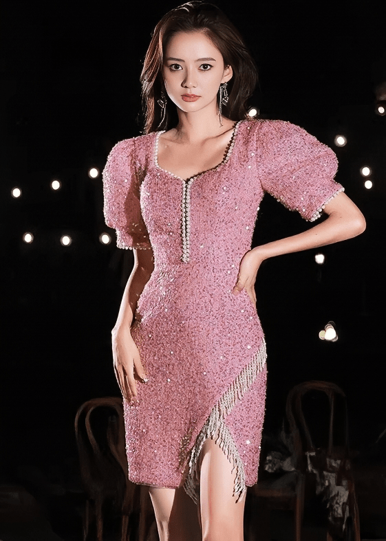 ビジューグリッターパフスリーブフリンジドレス - Vera Lumina