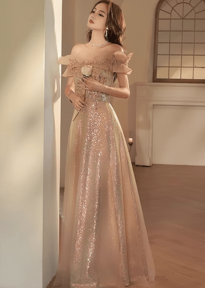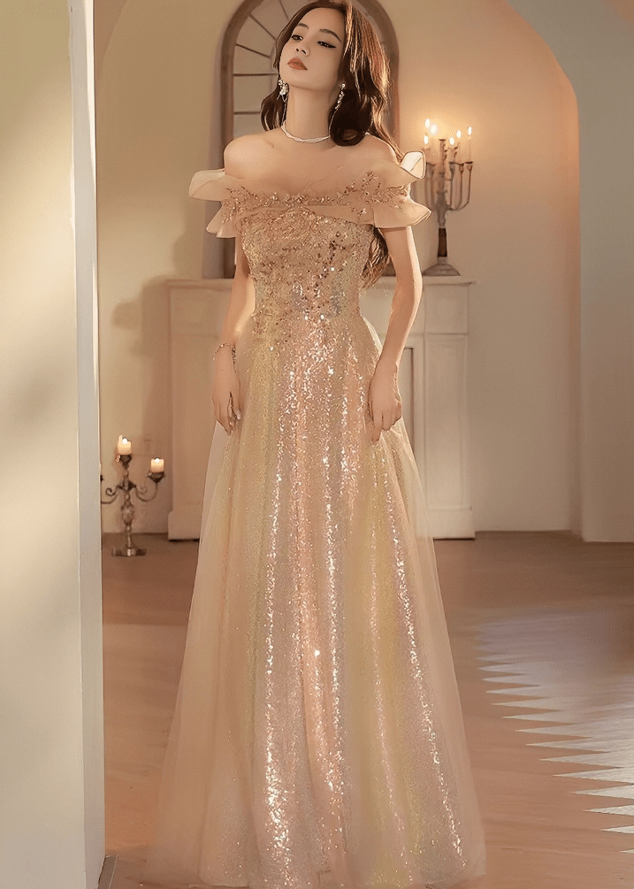 オフショルフリルビジューチュールAラインドレス - Vera Lumina