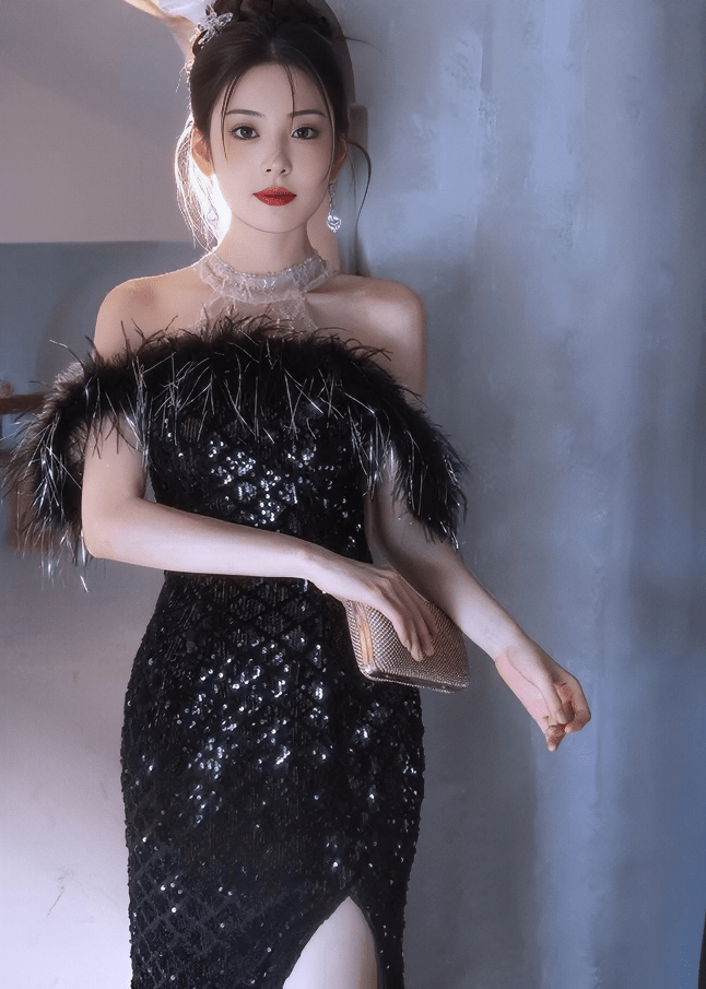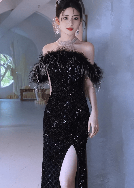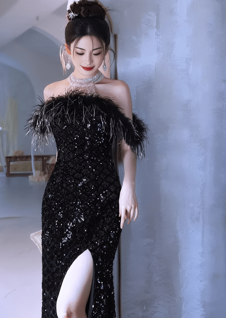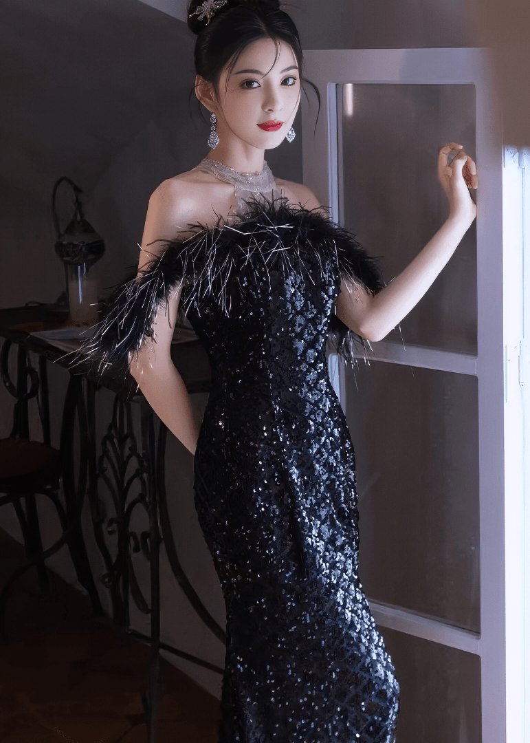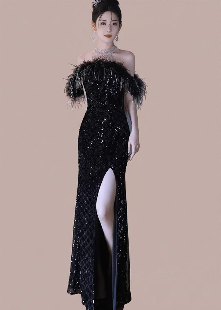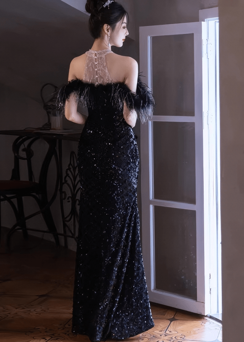羽毛露肩亮片长连衣裙