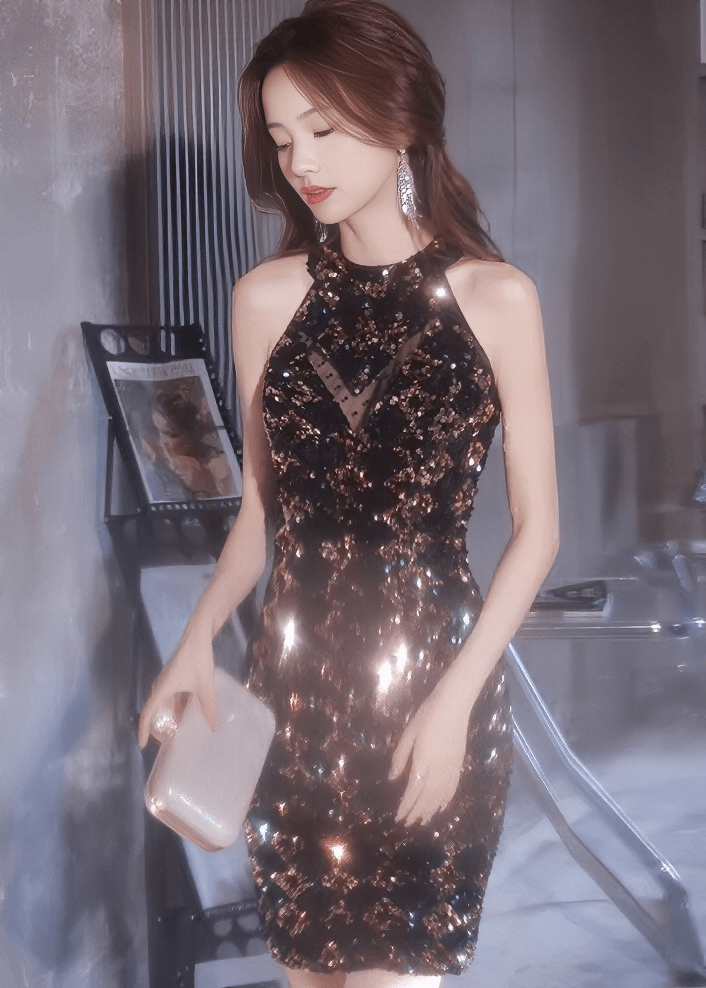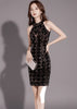 花朵串珠透明领喇叭连衣裙