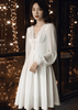正面飾帶透明泡泡袖喇叭連衣裙