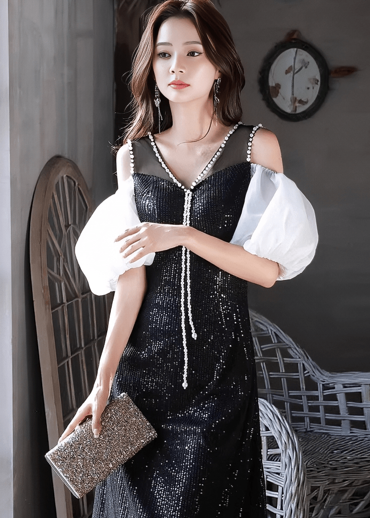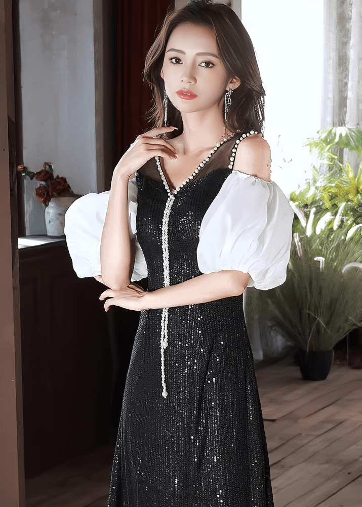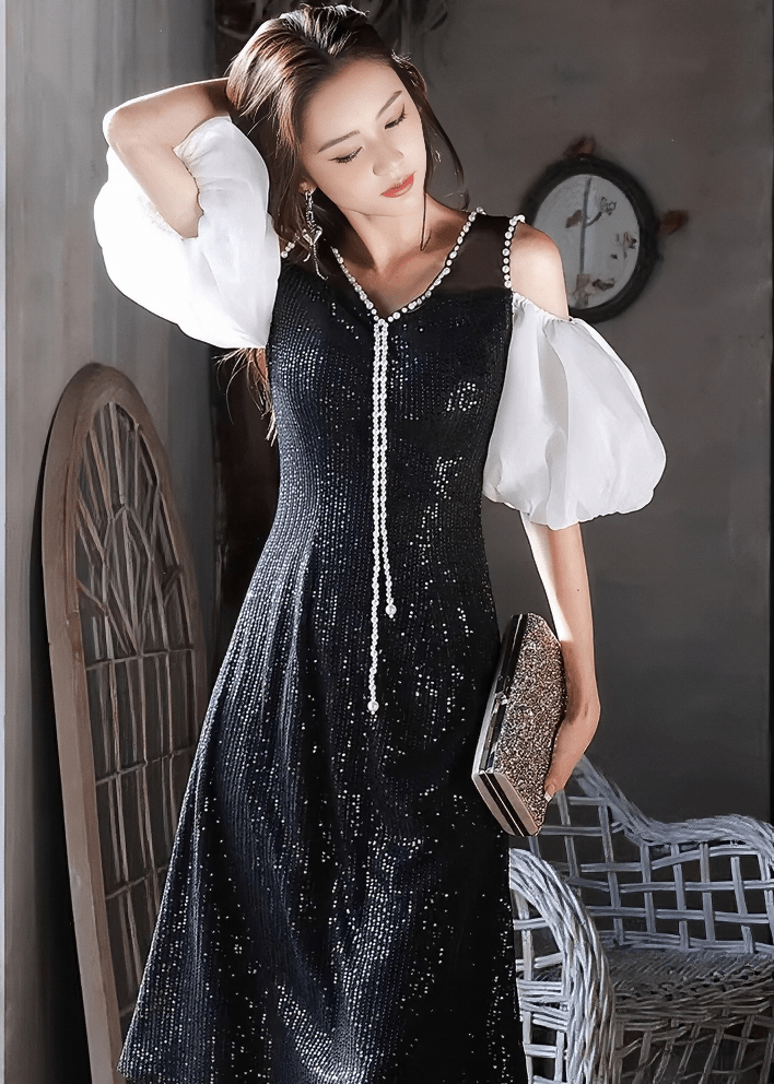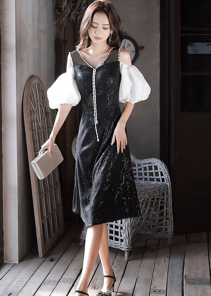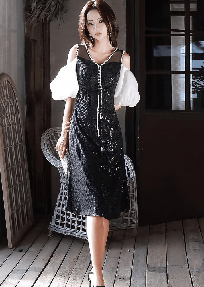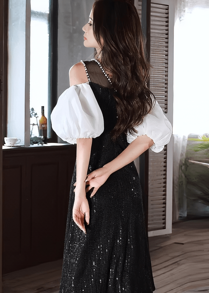 珍珠寶石泡泡袖喇叭連衣裙