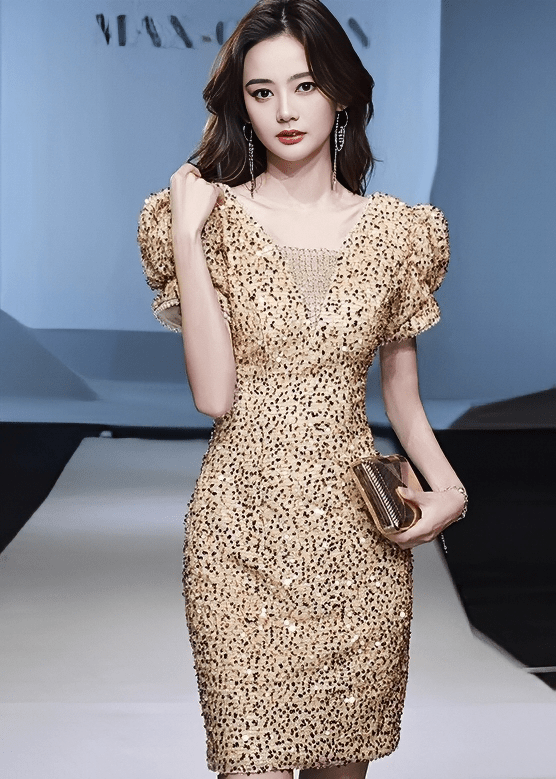 ビジューパールパフスリーブタイトドレス - Vera Lumina