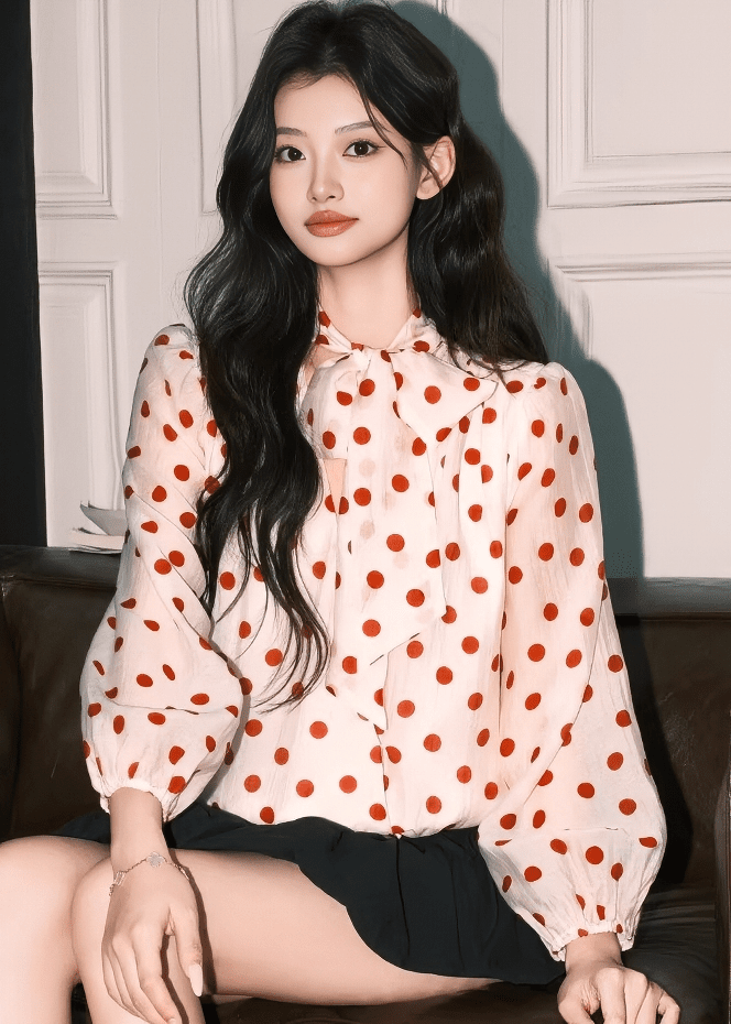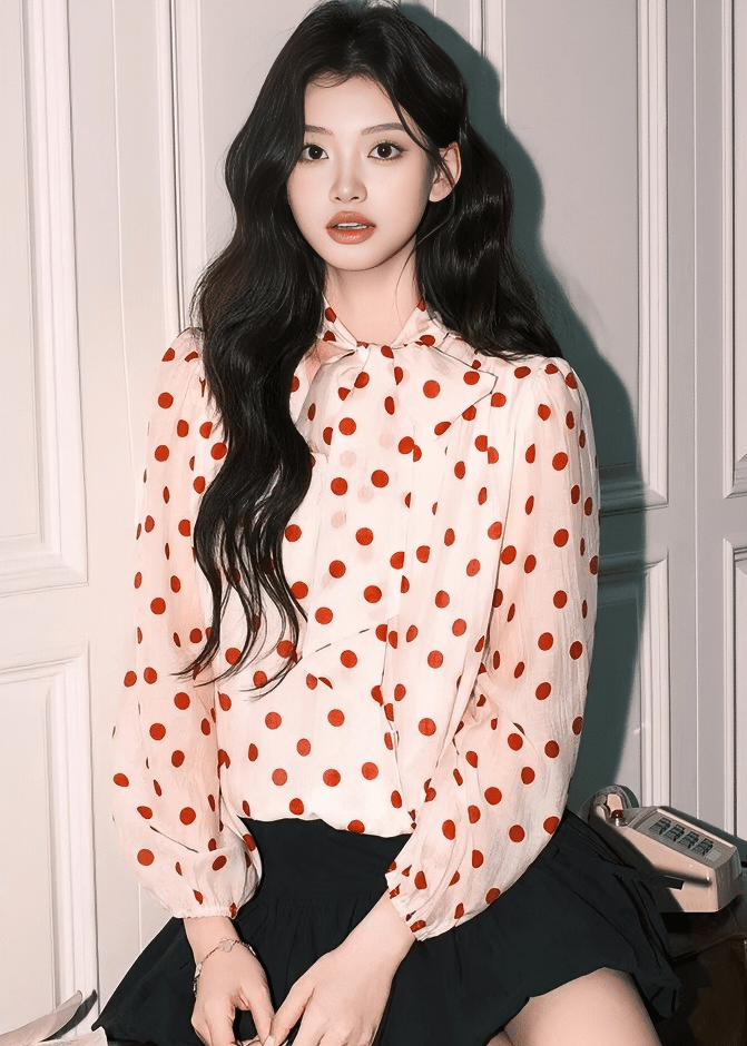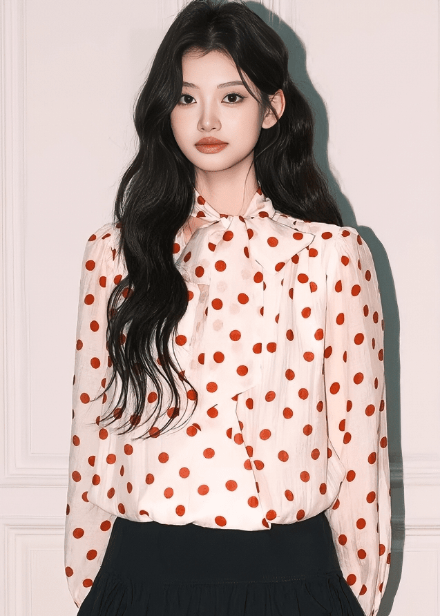 【DESIGN / STYLING】ドット柄に大きなボウタイリボンを添えたこのブラウスは、誰からも愛される「隙のない美しさ」を叶える一着です。顔周りを華やかに彩るリボンが、街灯の下でもレストランの薄暗い照明の中でも、あなたの表情を一段と輝かせます。