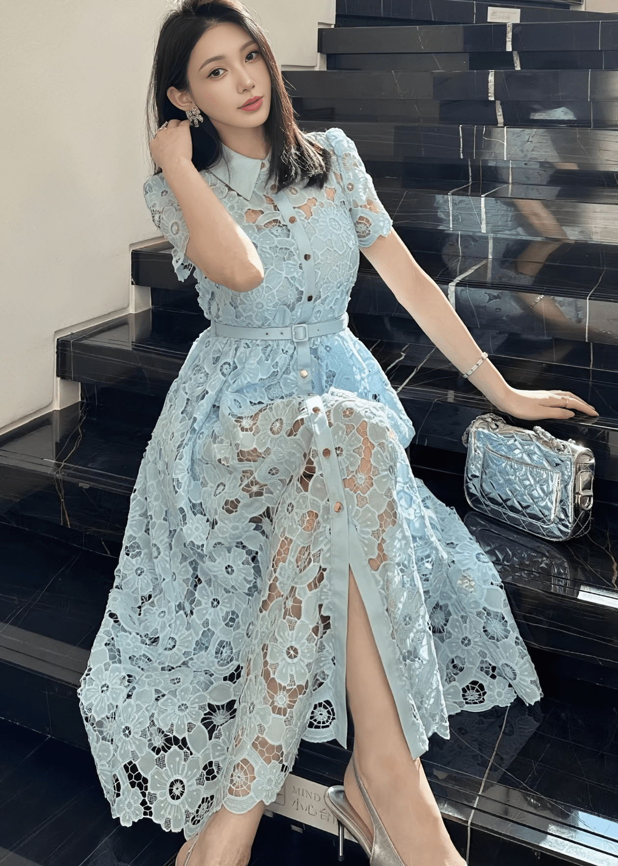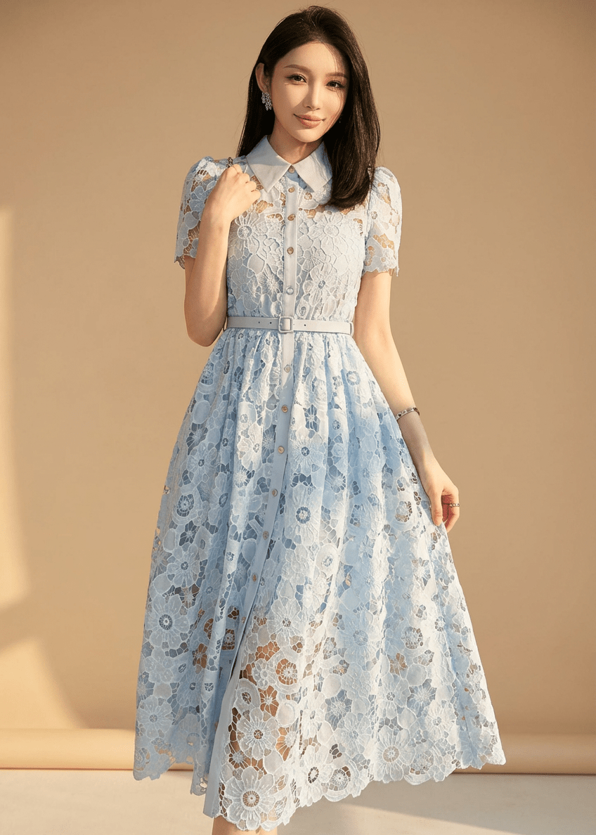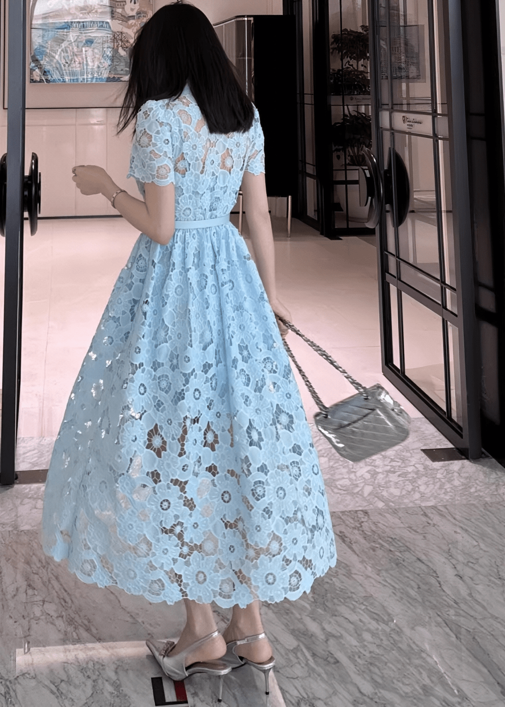 フラワーレースカラーパフスリーブフレアドレス - Vera Lumina
