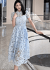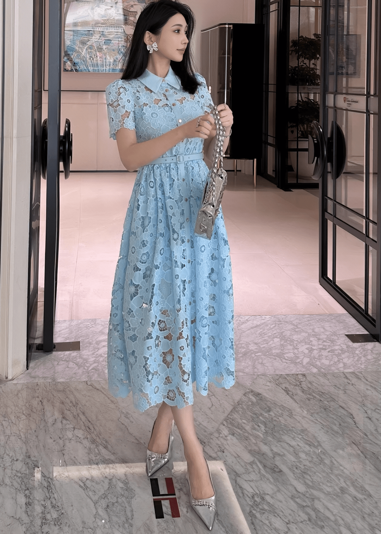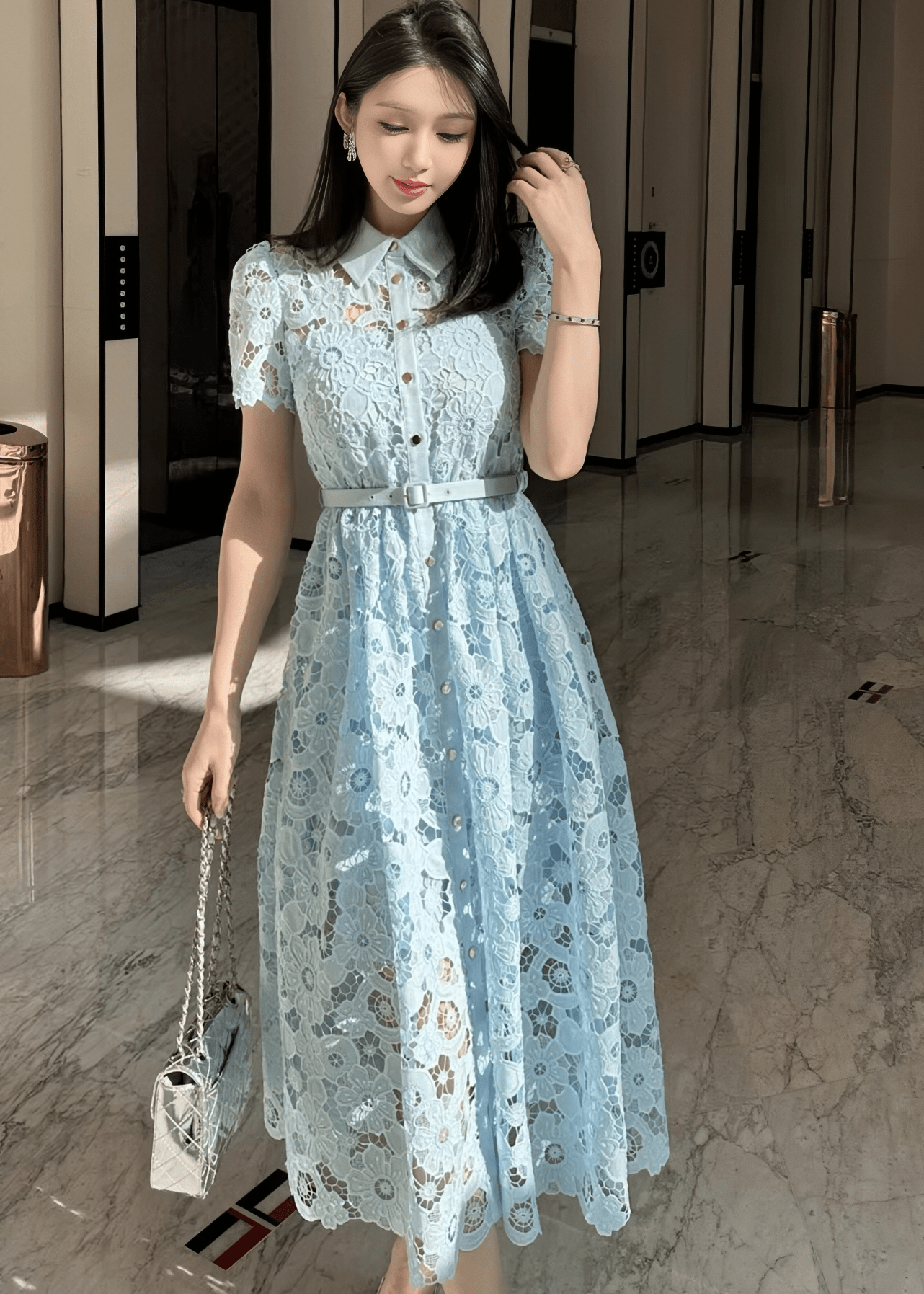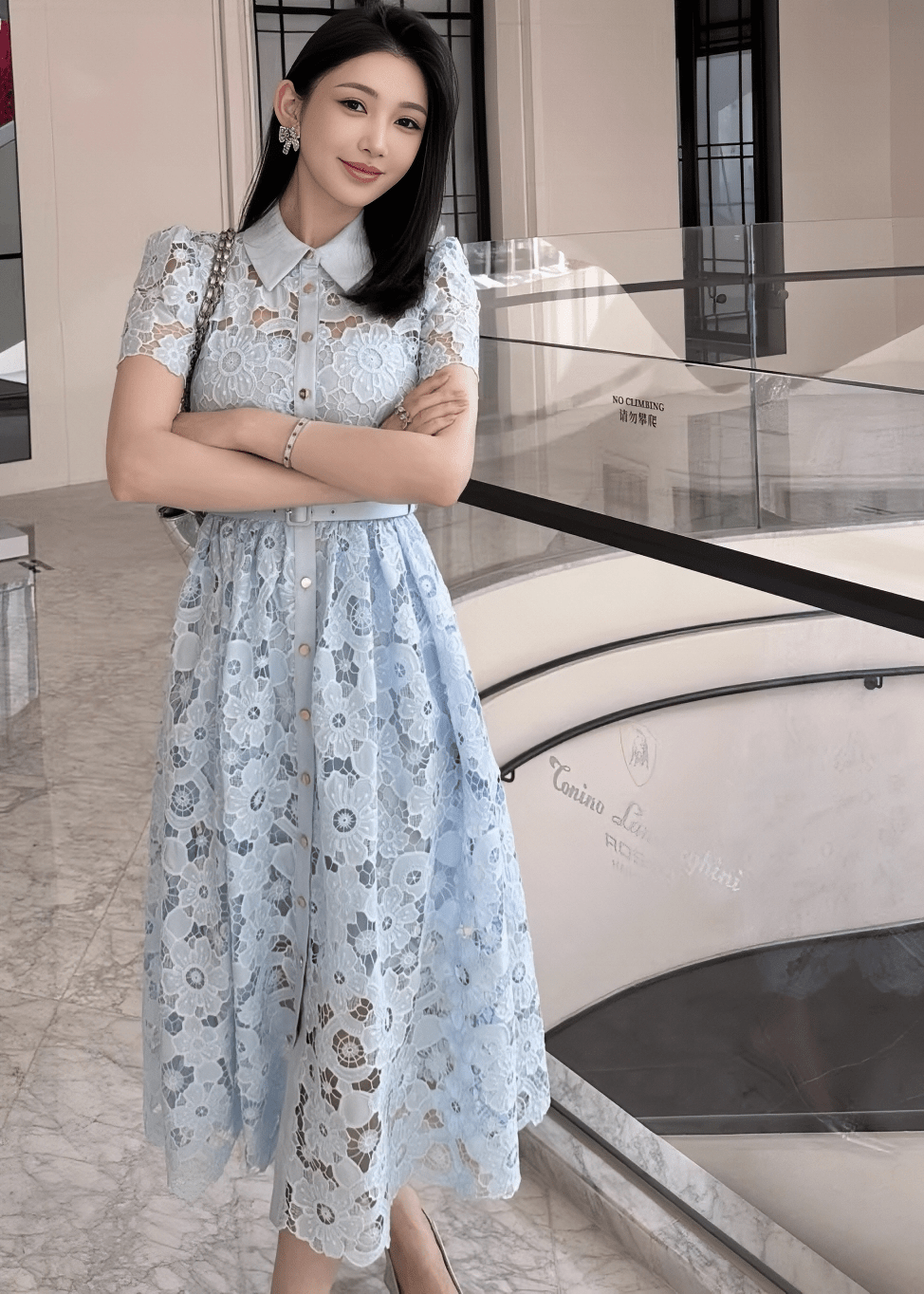 フラワーレースカラーパフスリーブフレアドレス - Vera Lumina